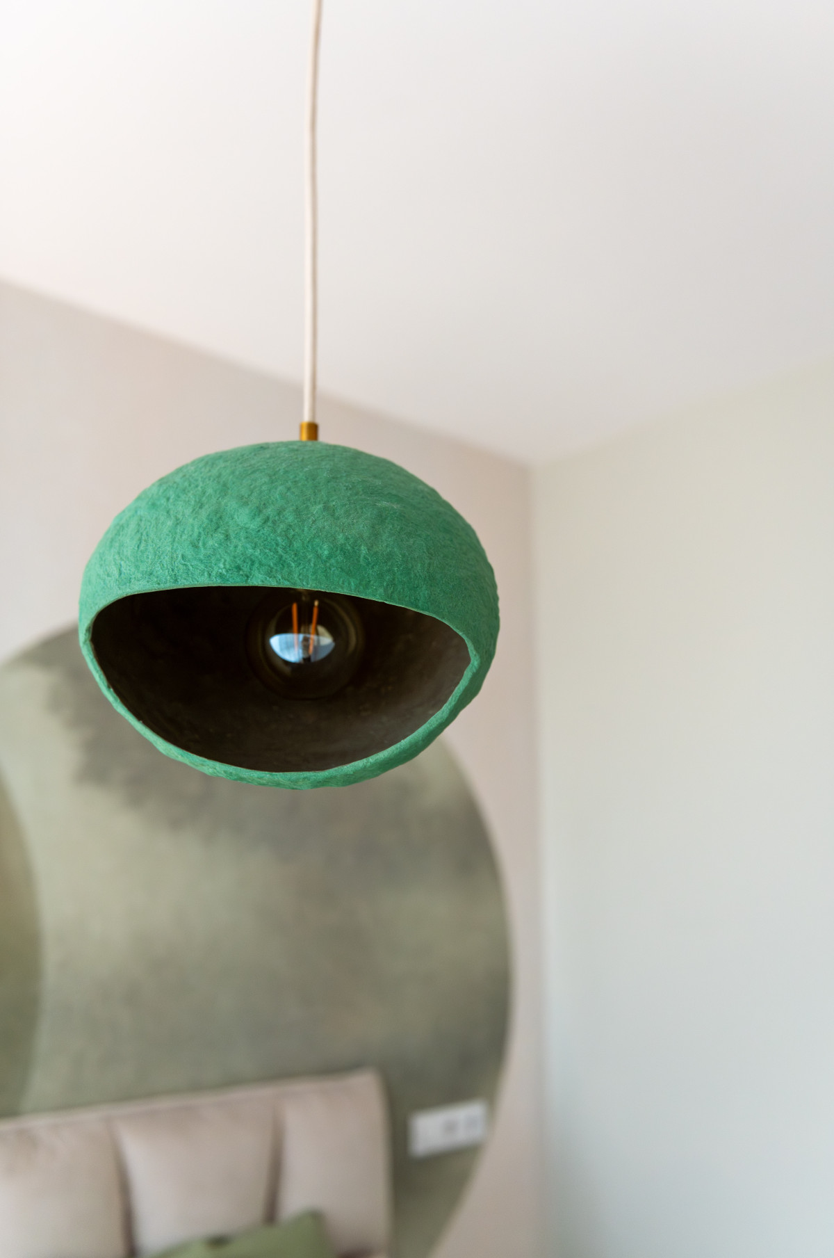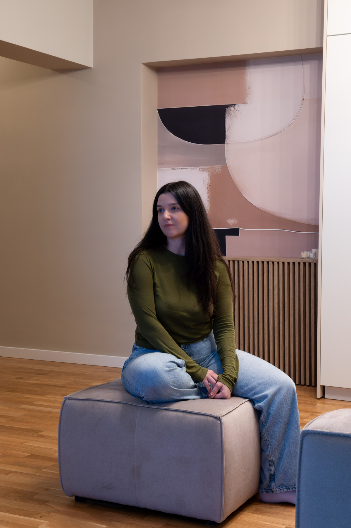 Selecția de finisaje XT Deco a fost instrumentală în crearea acestor puncte focale. În dormitor, tapetul Eclipse - Beige Green de la Rebel Walls introduce o geometrie fluidă, cercurile suprapuse în nuanțe pământii și vegetale inducând o stare de calm și relaxare, perfectă pentru zona de odihnă. Contrastând cu această zonă, livingul prinde viață datorită modelului Abstract Shapes - Burgundy (tot Rebel Walls). Aici, formele organice și tonurile profunde de vișiniu și teracotă adaugă dinamism și căldură, transformând peretele într-o piesă de artă statement care ancorează întreaga amenajare.